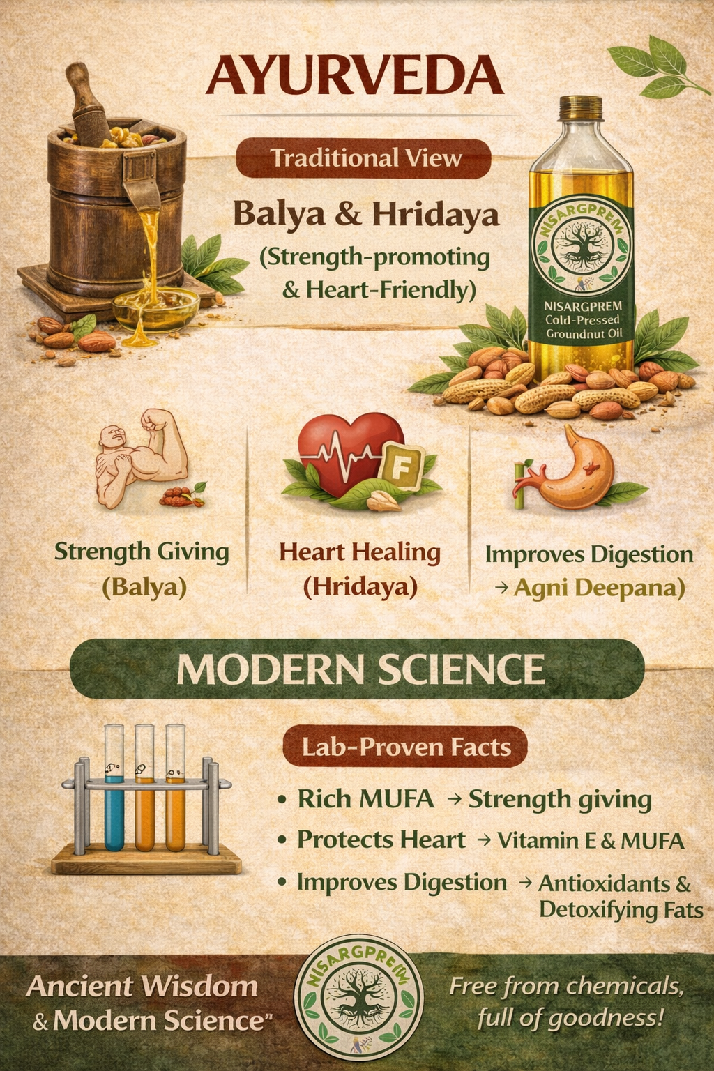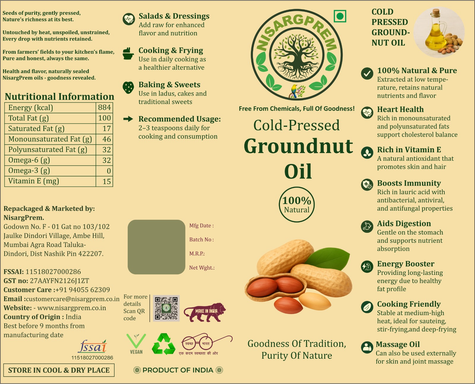 Extracted from the finest peanuts using the cold-press method, this oil retains its natural nutrients, aroma, and earthy flavor. Rich in heart-healthy fats, antioxidants, and vitamin E, groundnut oil supports immunity, digestion, and overall wellness. Its high smoke point makes it perfect for everyday cooking — from deep-frying to stir-frying — while adding a wholesome touch to every dish.