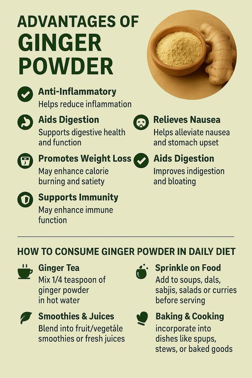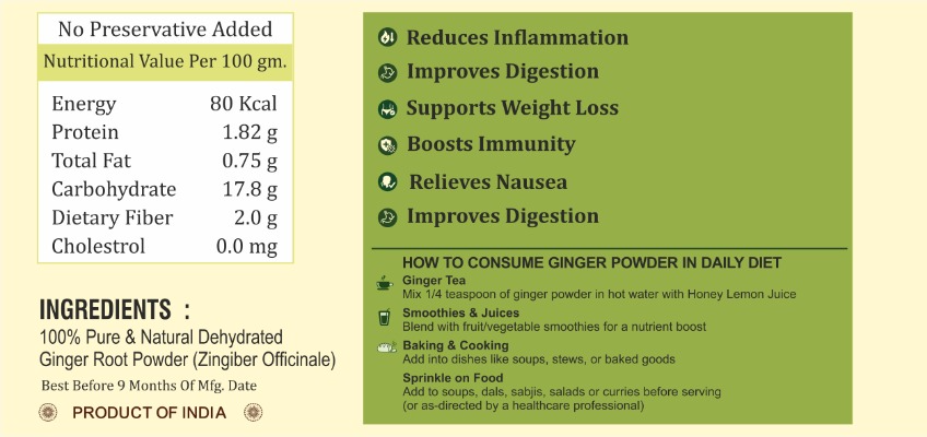 Known for its warm, zesty flavor and healing properties, ginger has been used in Ayurveda and traditional remedies for centuries. Rich in antioxidants and natural compounds like gingerol, it supports digestion, boosts immunity, and helps fight inflammation. Our ginger powder is made from premium dried roots, finely ground to preserve its aroma and potency — perfect for teas, curries, and daily wellness.