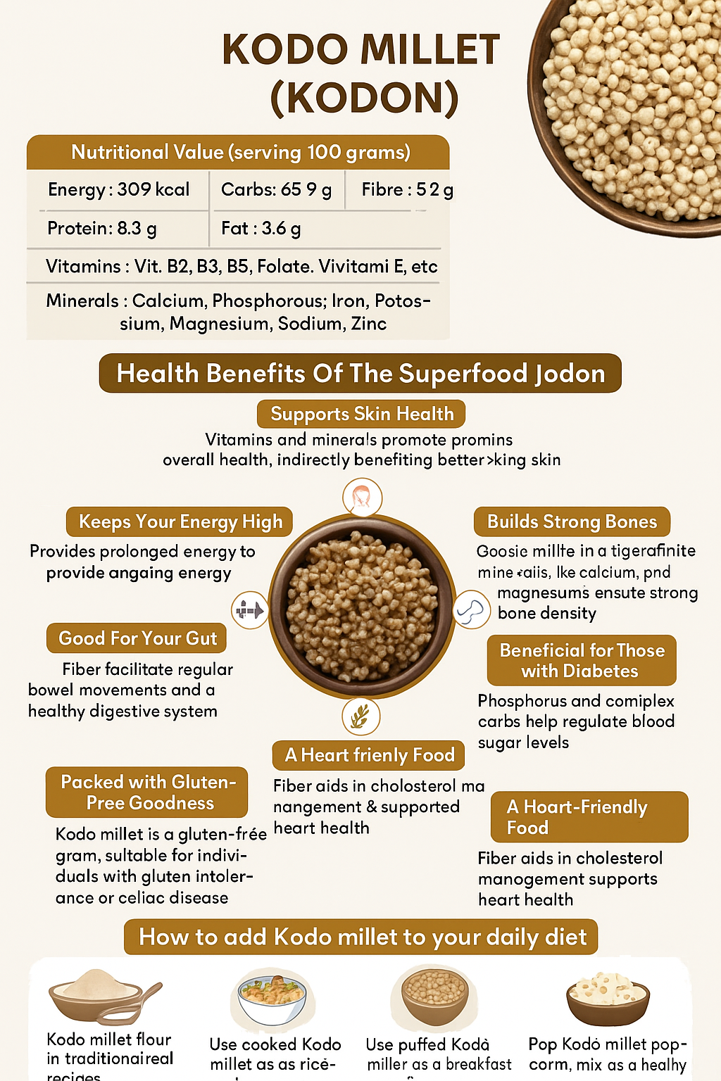 Kodo millet is an ancient, gluten-free grain celebrated for its high fiber, protein, and antioxidant content. Naturally light and easy to digest, it helps manage weight, control blood sugar, and support heart health. With its subtle flavor and fluffy texture, kodo millet makes a wholesome alternative to rice – perfect for pulao, khichdi, or salads.