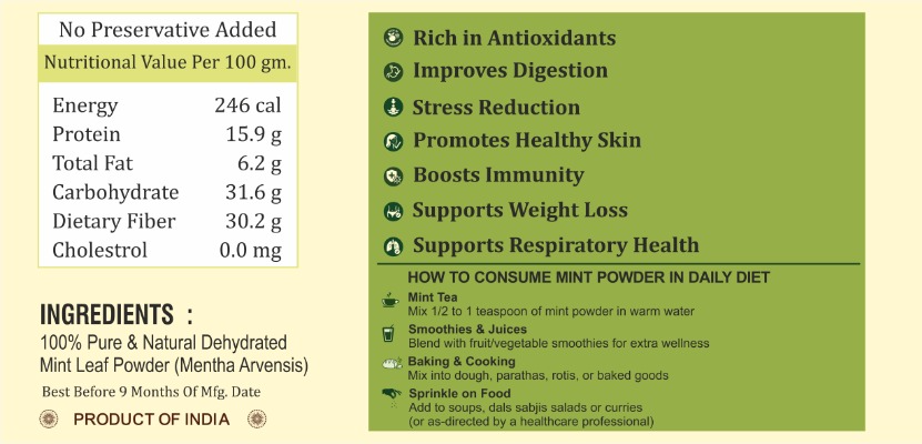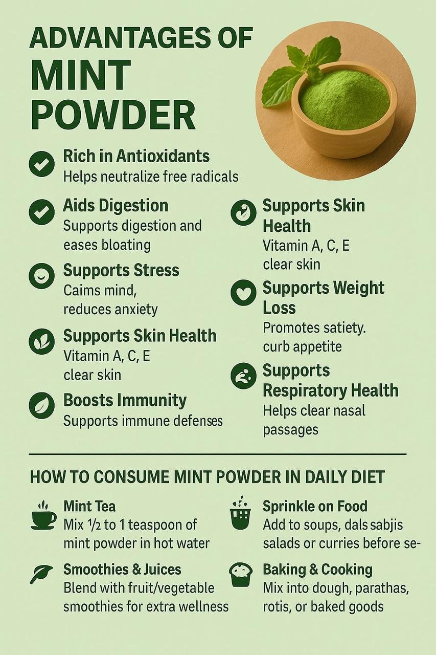 Refreshing and aromatic, mint is a natural coolant packed with antioxidants, vitamins, and digestive benefits. Our mint powder is made from carefully dried fresh leaves, preserving its vibrant flavor and soothing properties. Perfect for chutneys, teas, drinks, and seasoning, it adds a burst of freshness and wellness to everyday recipes.