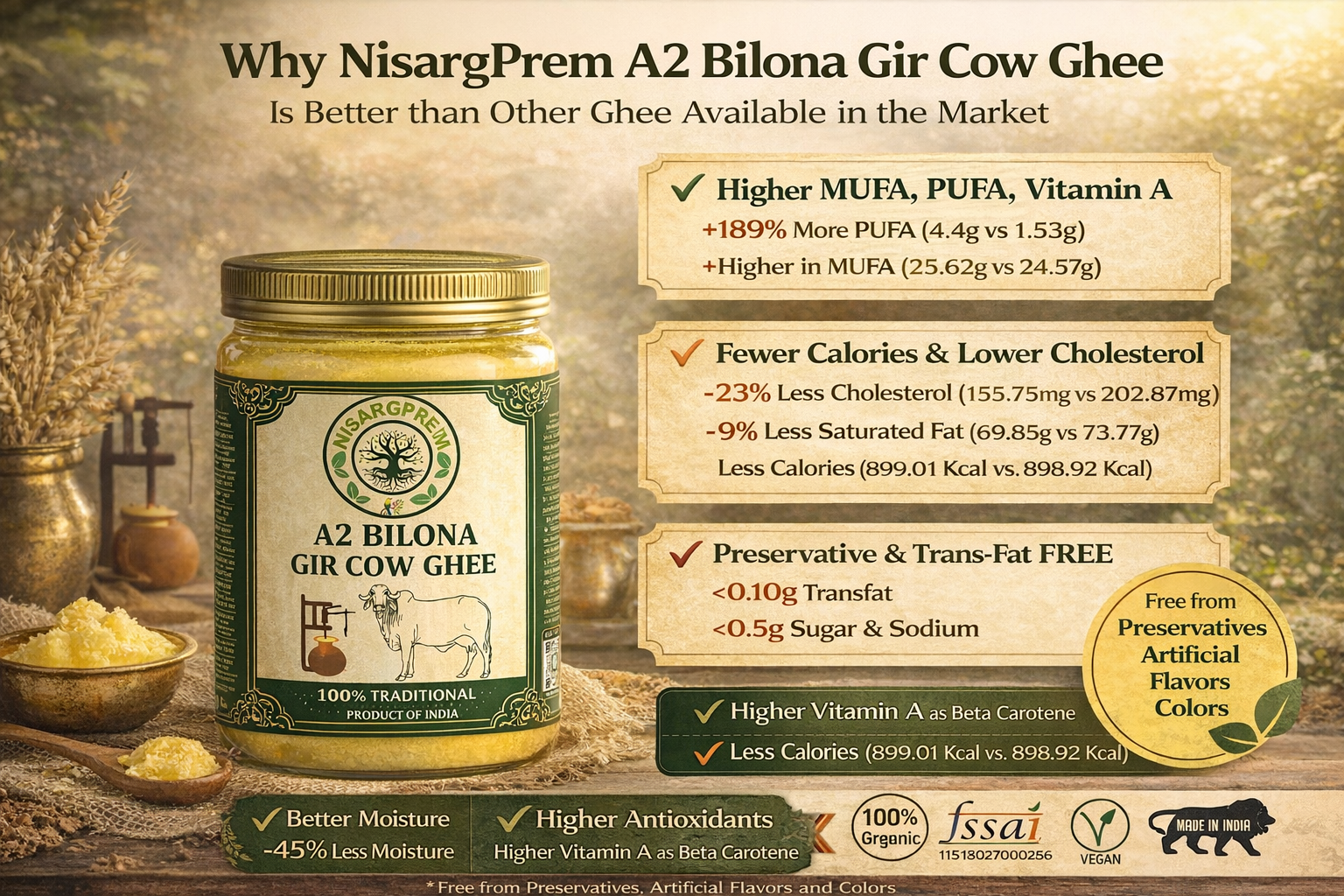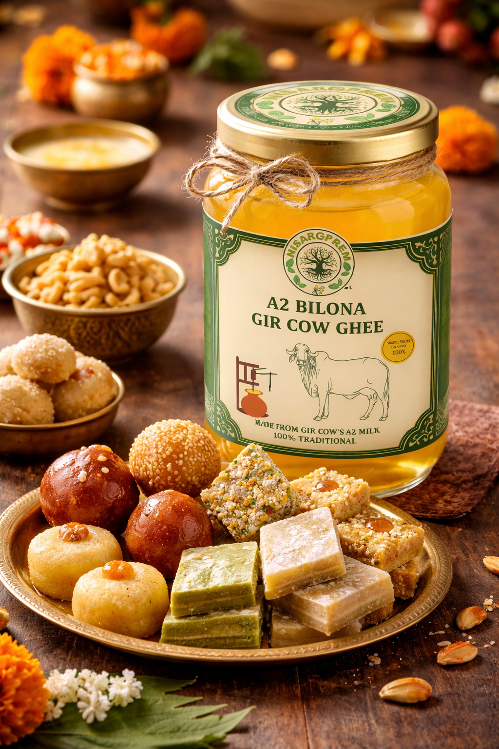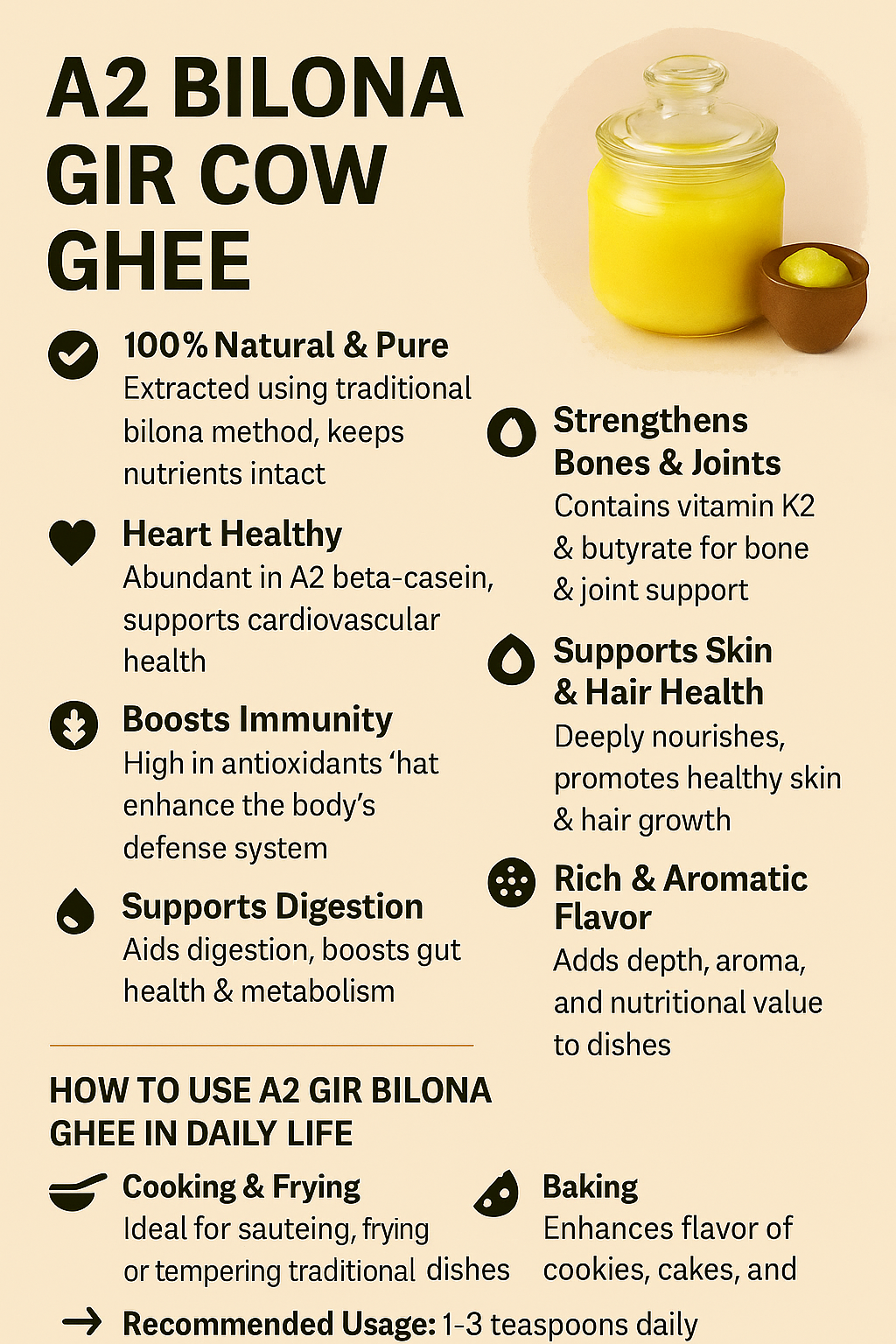 Made from the nutrient-rich A2 milk of native Gir cows, this ghee is hand-churned using the age-old bilona method. Its golden hue, rich aroma, and velvety texture reflect purity and tradition, while being naturally easy to digest and packed with essential fatty acids, vitamins, and antioxidants. A timeless superfood that blends luxury, wellness, and heritage in every spoonful.
