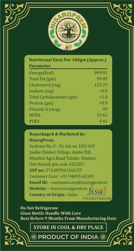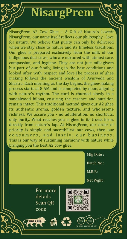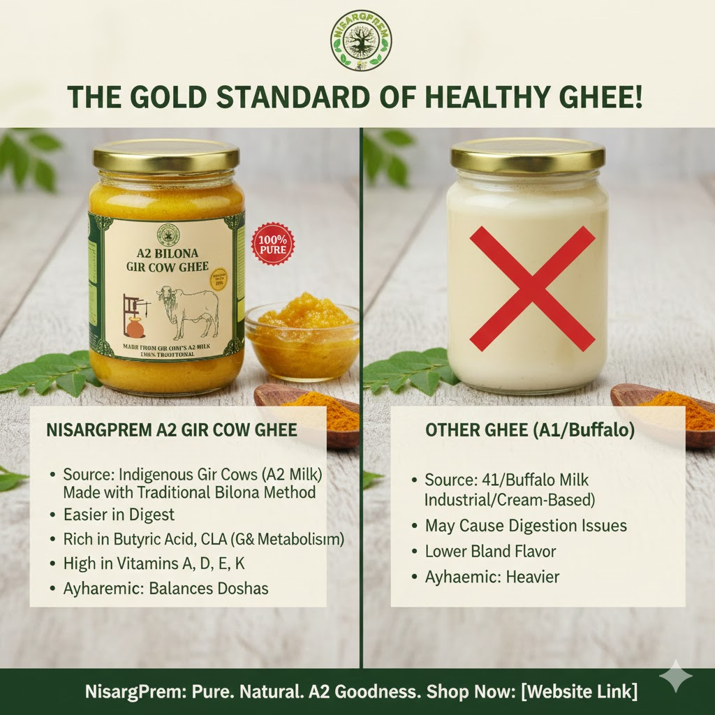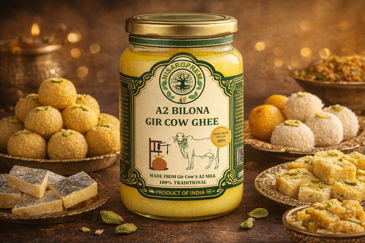Made from the nutrient-rich A2 milk of native Gir cows, this ghee is hand-churned using the age-old bilona method. Its golden hue, rich aroma, and velvety texture reflect purity and tradition, while being naturally easy to digest and packed with essential fatty acids, vitamins, and antioxidants. A timeless superfood that blends luxury, wellness, and heritage in every spoonful.